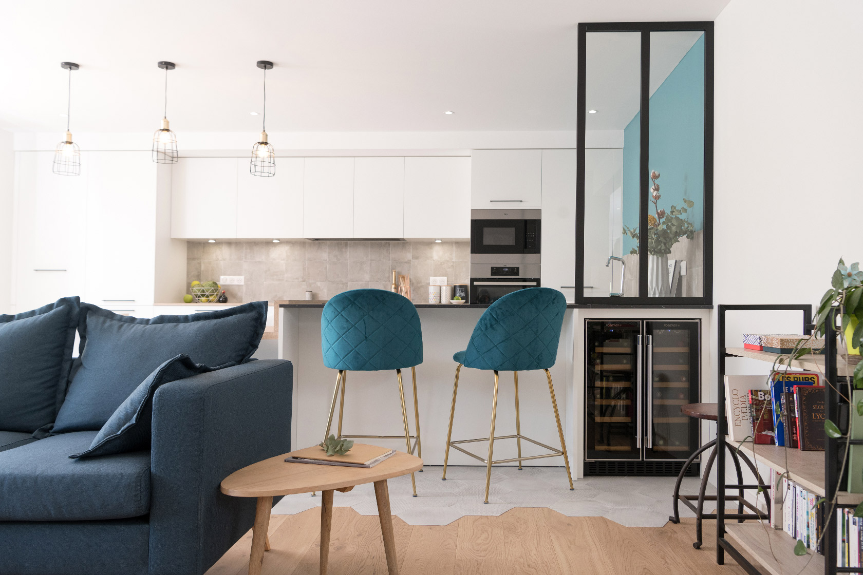 Au premier plan, on aperçoit le salon. Comprenant un canapé d’angle, une table basse, et une table d’appoint. Il est magnifique grâce à son canapé bleu nuit placé au centre de la pièce. Il rappelle volontiers le camaïeu de différents bleus créé dans cet espace. Effectivement, cette pièce de vie est travaillé de façon harmonieuse. À noter cependant une rupture au niveau des sols. La cuisine est réalisée en carrelage imitant un carreau de ciment gris à motif tandis que le salon est réalisé en parquet comme la majorité de l’appartement.